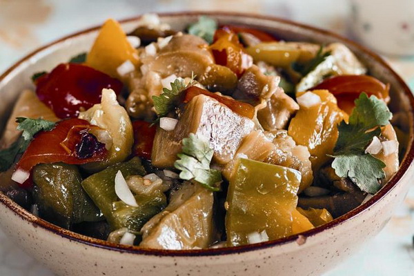 - 200 g de champignons frais, 2-4 tranches (30 g) de saindoux, 1 gousse d'ail, 200 g de poivrons rouges (sans cerneaux ni grains) ou de poivrons en conserve, 200 g de céleri-rave, 1 c. à l'aide d'une cuillère de persil finement haché, 2 c. à soupe de vinaigrettes, 2 c. à soupe d'huile végétale, 1 tasse de vin rouge sec.