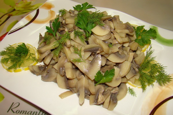 Pour faire une simple salade de champignons, tous les produits doivent être coupés en belles tranches et mélangés avec de la crème sure, du sel, du sucre et de la moutarde.
