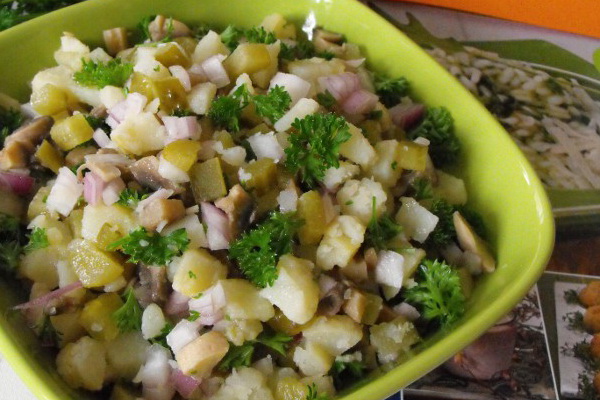 Couper les champignons marinés, les pommes de terre bouillies et les concombres en petits morceaux. Ajoutez des oignons finement hachés, mélangez le tout avec de la crème sure, du sel, du sucre, du vinaigre. Mettre le mélange dans une casserole et saupoudrer d'aneth ou de persil.