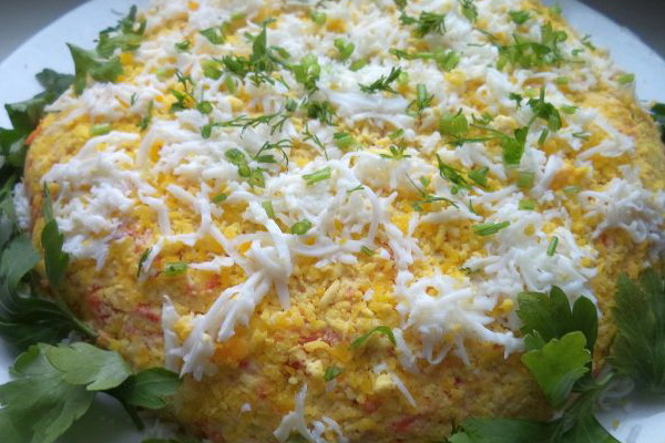 200 g de champignons cuits dans leur propre jus, 400 g de tomates, 200 g de crème sure ou de mayonnaise, 300-350 g de hareng, 80-100 g d'oignons, 2 œufs à la coque, 1-2 c. cuillères à soupe de fromage cottage, 1 concombre mariné, persil.