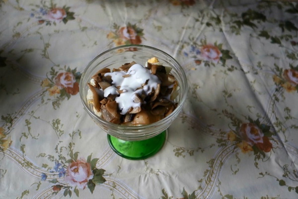 Couper les champignons marinés ou salés en gros morceaux, ajouter aux œufs des œufs durs et des oignons émincés, verser la crème sure.