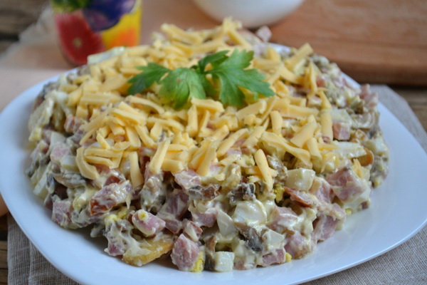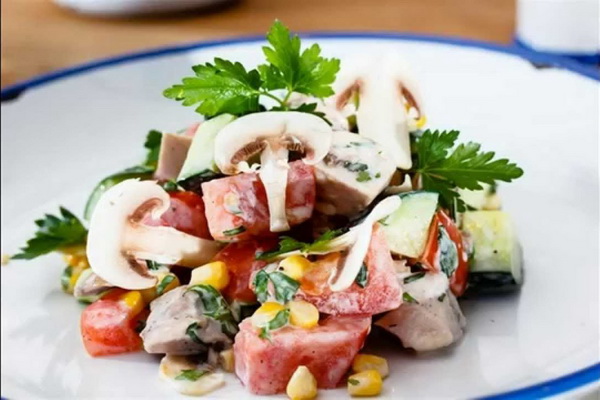 Voici des photos et des recettes de délicieuses salades aux champignons et aux produits à base de viande.