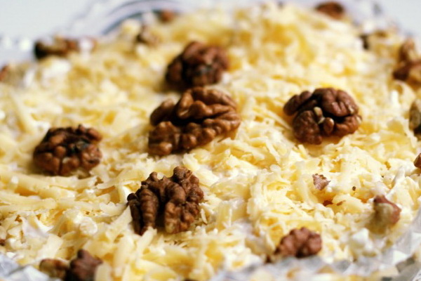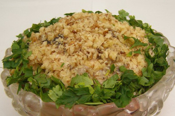 Faites attention à la photo: la salade de champignons doit être saupoudrée de moitiés de noix, d'olives hachées et de rondelles de poireau frais: