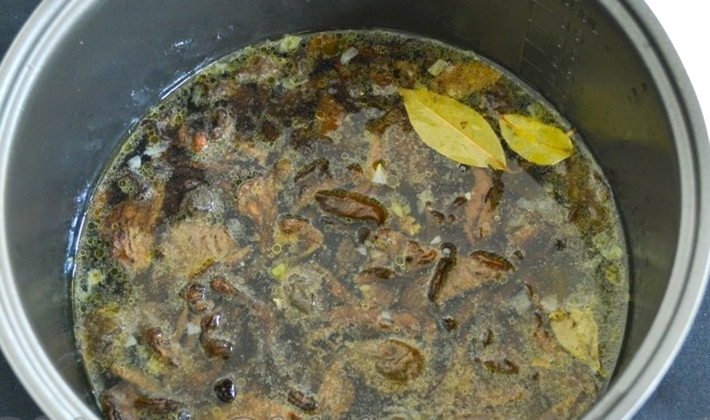 Une fois que les champignons sont remplis avec 1,5 tasse d’eau et infusés pendant 2 heures, vous pouvez passer à la partie principale de la cuisson.