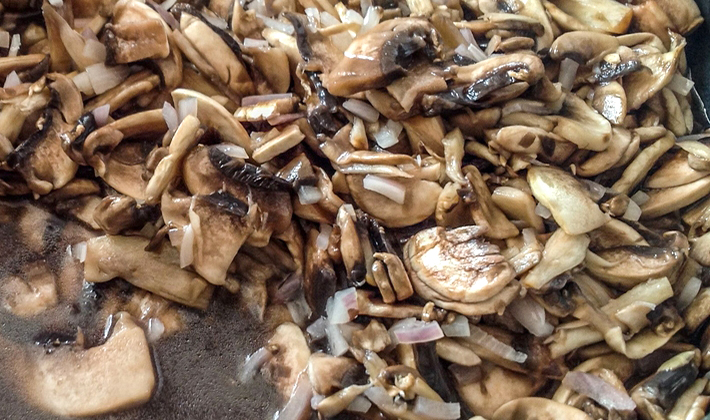 Verser les champignons dans la poêle en les versant avec le bouillon.