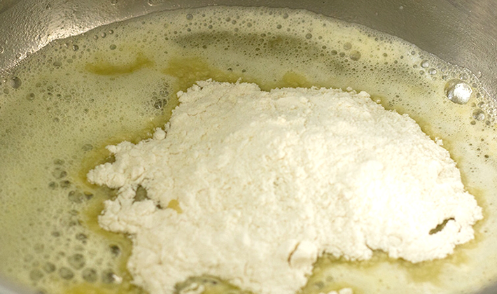 Moulez la farine avec le beurre fondu et faites-la frire à feu doux pendant 4 à 5 minutes, après quoi vous devrez y introduire soigneusement le liquide préparé.