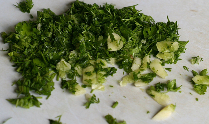 Moudre l'ail avec les herbes et l'ajouter à la sauce, cela donnera au plat une touche de piquant.
