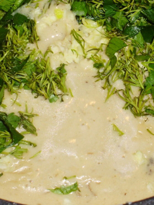 Mélanger le mélange obtenu, couvrir et laisser bouillir pendant 15 minutes. Mélanger la farine avec la crème sure pour obtenir une masse uniforme sans grumeaux. La crème sure et la farine versent lentement dans le bouillon en remuant constamment. Cuire 10 minutes. à feu doux. Ajouter le persil haché et laisser bouillir pendant 3-5 minutes.