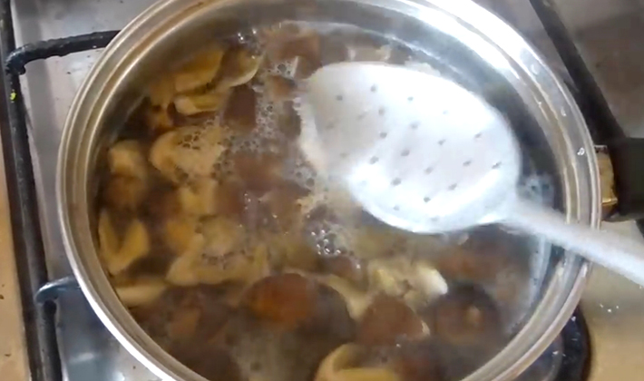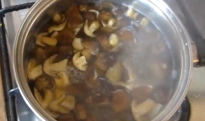 - Dans de l'eau salée, faites bouillir les champignons à feu moyen pendant 30 minutes, en éliminant la mousse obtenue.