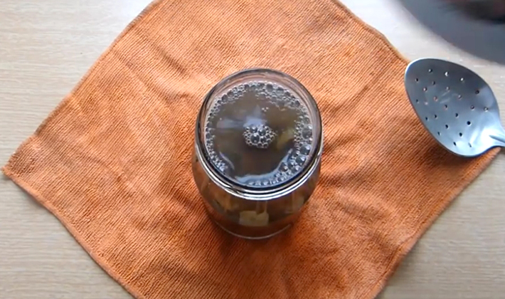 - Égouttez complètement et faites cuire la marinade: dissolvez le sucre, salez dans l'eau, mélangez et amenez à ébullition.