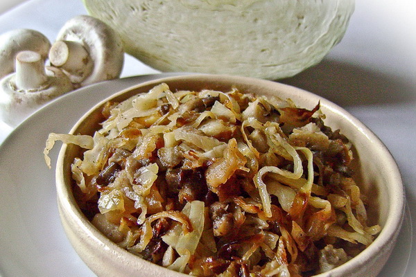 Pour ce faire, hachez le chou, mettez-le dans une casserole, ajoutez de l'eau, laissez mijoter 10 minutes. Lavez, séchez et épluchez les champignons. Couper les champignons en tranches, les oignons épluchés en demi-anneaux, les faire frire dans l'huile végétale pendant 20 minutes, combiner avec le chou. Mettez dans une passoire, salez, poivrez, ajoutez le fromage râpé, mélangez.