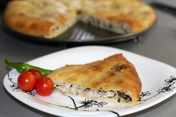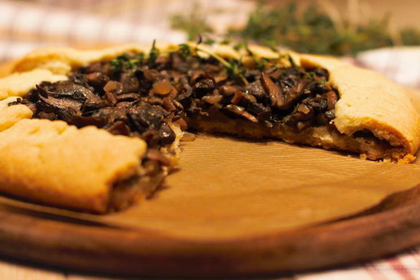 Saupoudrer la plaque de cuisson avec de la farine, étendre la pâte en un gâteau. Placez la garniture au centre, pincez les bords. Pétrir le gâteau du centre vers les bords, faire un trou au milieu pour permettre à la vapeur de sortir. Cuire au four chauffé à 200 ° C pendant 10 minutes. Au moment de servir, graisser la tarte aux champignons préparée selon cette recette avec du beurre fondu.
