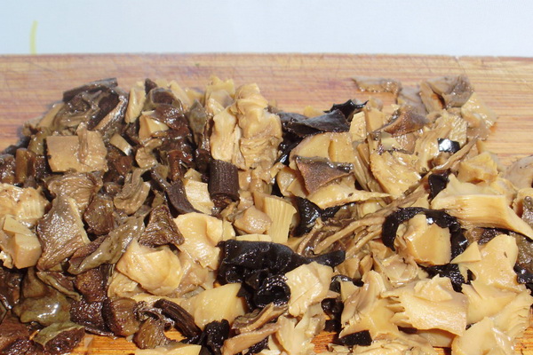 Cuisson de la viande hachée. Rincer les champignons séchés, cuire, hacher finement et faire frire dans l’huile, puis ajouter les oignons grillés finement hachés, le sel, le poivre et mélanger.