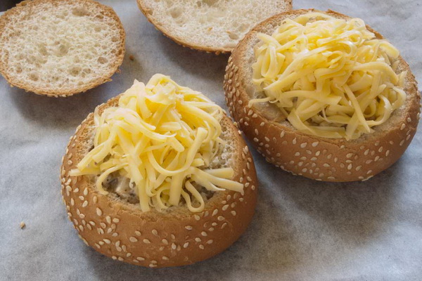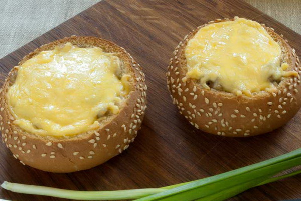 Couper le dessus des pains, enlever la chair, les graisser à l'intérieur et sur les côtés avec de l'huile. Ensuite, remplissez de fricassée de champignons (voir ci-dessous), mettez une feuille graissée. Selon cette recette, les petits pains aux champignons doivent être laissés au four jusqu'à ce qu'ils soient dorés.