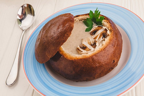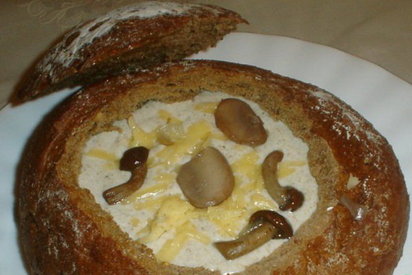Séparément, faites bouillir les champignons dans de l'eau avec de l'huile végétale, versez la sauce préparée et laissez bouillir un peu à feu doux. Ensuite, prenez un pain rond, coupez la partie inférieure de la croûte, retirez la mie pour former une dépression. Sécher le pain, graisser avec de l'huile et mettre sur le plat avec le creux. Ajouter les champignons aux jaunes, un peu de crème, le jus de citron et l'huile végétale. Mélangez le tout, mettez rapidement en chignon et servez.