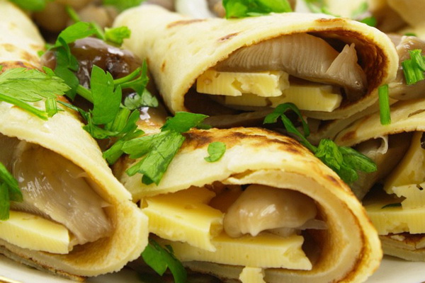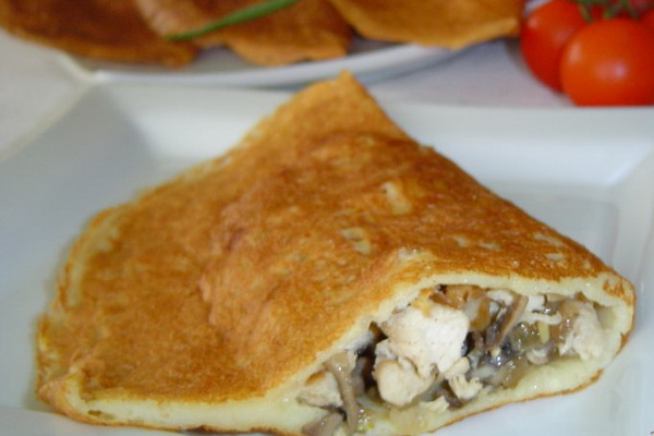 Rincer les champignons, faire bouillir dans une petite quantité d’eau salée, filtrer et, avec le petit pain trempé et pressé, passer à travers le hachoir à viande. Hacher finement l'oignon, le faire revenir au beurre, mélanger avec la masse de champignons, ajouter l'huile, le sel, le poivre et bien mélanger. Mélanger des parties égales de lait et d'eau salée, battre un œuf cru et, en ajoutant un peu de farine, pétrir la pâte. Versez quelques cuillères à soupe dans un bol séparé. Cuire au four 9-12 crêpes minces à partir de la pâte et, pendant qu'elles sont chaudes, étendre une couche de garniture cuite.