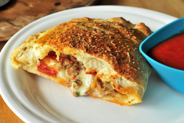 140 g de pâte à pizza, huile d'olive à graisser, farine sur la poussière. Farce: 75 g de boeuf haché, 40 g de bacon cru fumé, 75 g de mozzarella, 40 g de champignons, 75 g de pâte de tomate ou de sauce à pizza préparée.