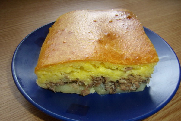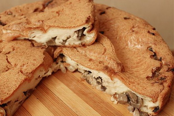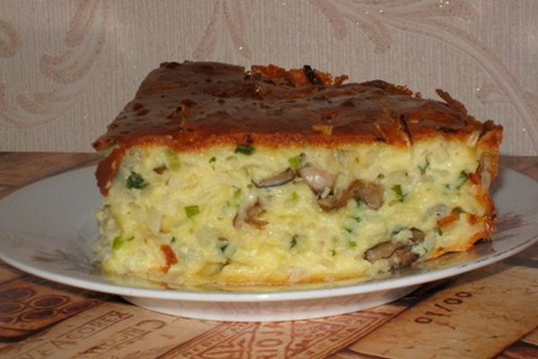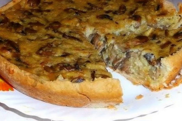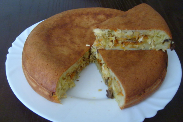 Un copieux gâteau sera une bonne aide pour les invités. En outre, il est parfait pour le menu de tous les jours. Cette variante de la tarte en gelée peut être préparée sans pommes de terre, seulement ensuite ajouter plus de champignons.