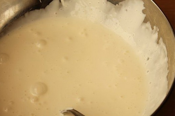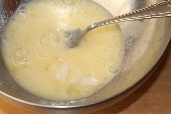 Le kéfir tiède est mélangé avec du beurre fondu, du sucre, du sel, des œufs sont ajoutés et battus au fouet.