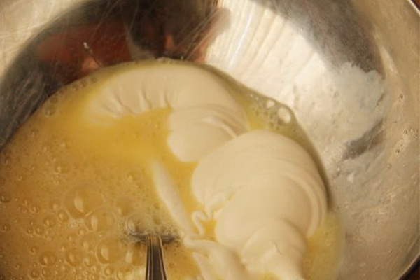 Mélangez les œufs, la mayonnaise, la crème sure, le sel, battez le tout avec un fouet.