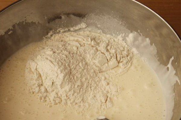 Le kéfir chaud est versé, la poudre à pâte et la farine tamisée sont coulés, fouettés.