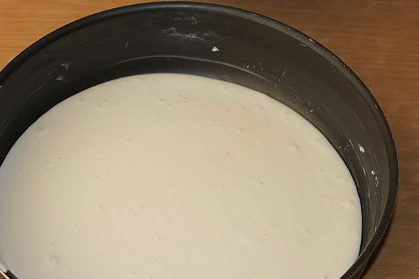 Introduisez la farine tamisée et la levure, battez et versez dans la forme dans laquelle se trouve la garniture.