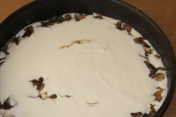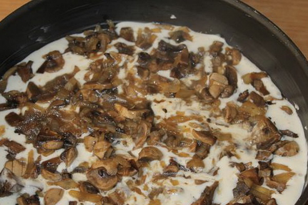 Versez la pâte (une moitié) dans un plat graissé, étalez les champignons et ajoutez la seconde moitié.