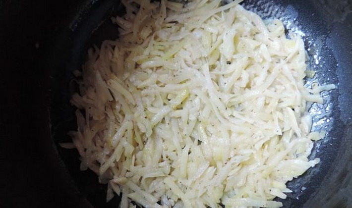 Râpez grossièrement les pommes de terre et versez de l'eau bouillante dessus pendant 4-5 minutes. Puis jetez-le dans une passoire jusqu'à ce que l'eau soit complètement drainée.