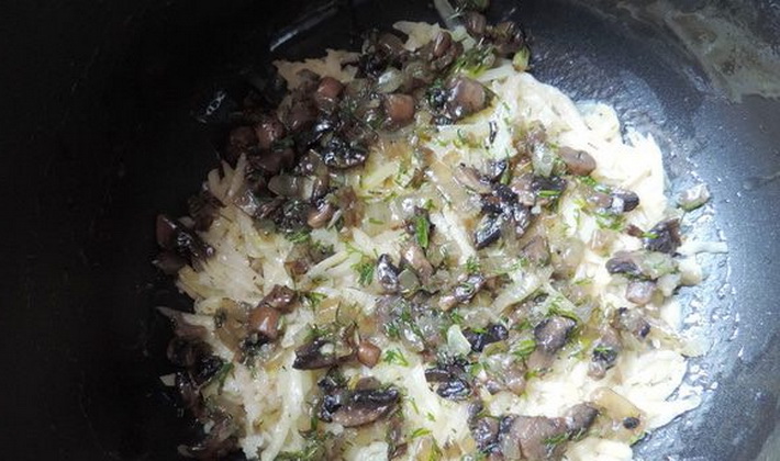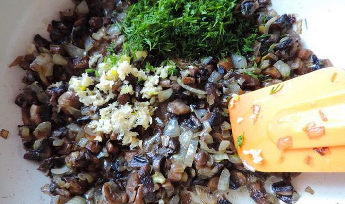 Hacher finement l'aneth et presser l'ail à l'aide d'une presse. Mélanger avec les champignons et laisser suer dans une casserole sous le couvercle pendant 2-3 minutes.