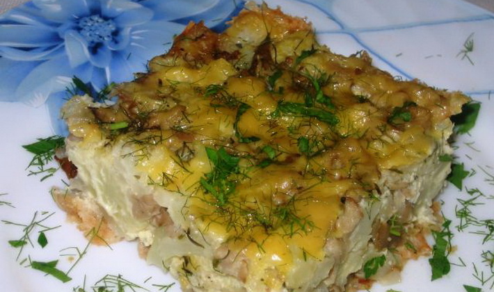 Méthode de préparation: Épluchez les pommes de terre crues, coupez les en tranches, mélangez avec le chou-fleur, les œufs battus, la chapelure, le sel et le poivre. Mettez le mélange dans une forme graissée, saupoudrez de fromage râpé. Faites cuire une casserole de champignons, de chou et de pommes de terre dans un four préchauffé à 180 ° C pendant 5 minutes.
