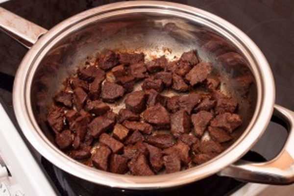 Au bout d'une demi-heure, égouttez la sauce soja, pressez la viande, mettez-la dans une casserole sur laquelle l'huile de tournesol a déjà été chauffée. Il est nécessaire de faire frire la viande à feu vif pour que la croûte qui en résulte vous permette de conserver tout le goût et l’arôme de chaque morceau de viande.