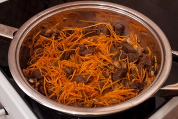 Dès que la viande est recouverte d'une croûte, il faut ajouter les carottes et les champignons, saler tous les ingrédients avec du poivre. Cuire encore 10 minutes en remuant. Servir avec un accompagnement de riz ou de pommes de terre nouvelles.