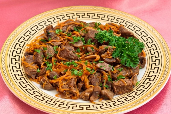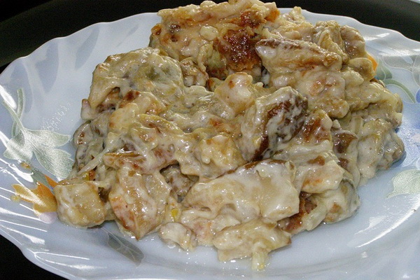 Correctement préparé avec une âme, un plat est toujours délicieux. La viande très tendre et exceptionnellement savoureuse est frite avec des champignons à la crème sure, qui peuvent être servis en toute sécurité sur la table de vacances et assurez-vous que les clients ne resteront pas affamés.