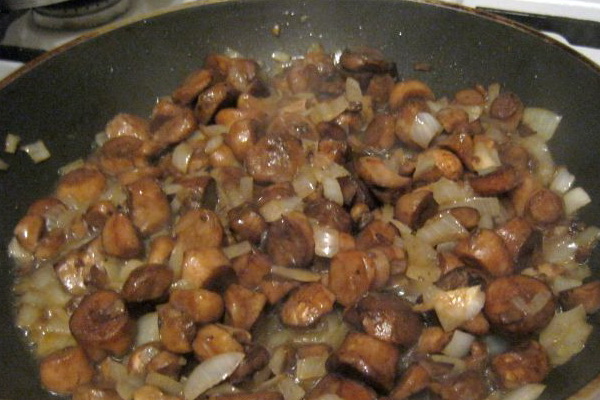 Vous devez d'abord faire frire les oignons pendant 3 à 5 minutes jusqu'à ce qu'ils soient transparents, puis y ajouter les champignons. Lorsque les oignons et les champignons commencent à brunir, vous devez leur ajouter des morceaux de goulache, bien mélanger et couvrir. Il est important de veiller à ce que toute l'humidité des champignons s'évapore et qu'aucun liquide ne reste dans la casserole.