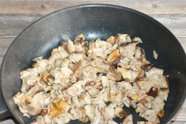 Épluchez les parapluies, essuyez-les avec une éponge de cuisine humide et coupez-les en lamelles, faites-les frire jusqu'à cuisson, environ 20 minutes.