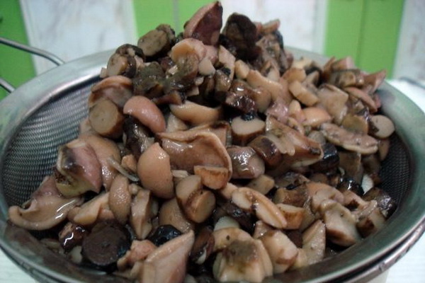 Faire bouillir les champignons, égoutter, couper en rondelles et les faire frire dans l'huile.