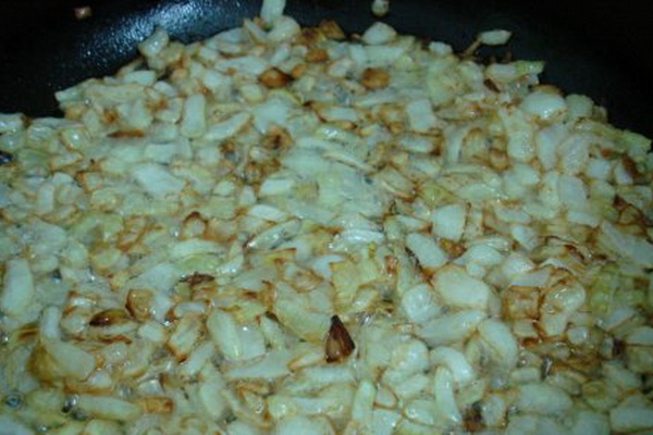 Épluchez les oignons, coupez-les en cubes et faites-les revenir au beurre jusqu'à ce qu'ils soient dorés.