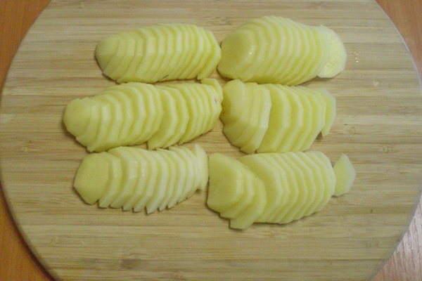 Épluchez, lavez et coupez les pommes de terre en fines tranches.