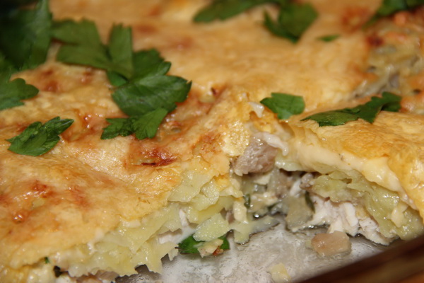 Disposez de petits morceaux de “Mozzarella” dans le moule, répartissez les pommes de terre hachées avec la couche suivante, versez-les avec l'oeuf et le fromage. Mettez au four préchauffé et faites cuire pendant 20 minutes à 190 ° C.