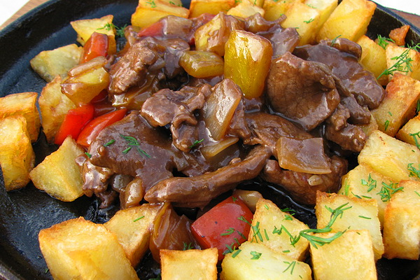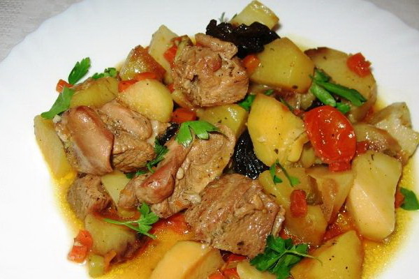 Couper les pommes de terre en gros morceaux. Des portions (1 à 2 par portion) sont découpées dans la viande (partie dorsale et pelvienne). Les oignons, la poitrine de porc fumée sont coupés en dés et frits avec de la viande. Empilez la viande dans une casserole, remplissez-la de bouillon, versez le vin de raisin rouge, ajoutez les épices et faites mijoter jusqu'à tendreté avec une légère ébullition. Ajoutez des pommes de terre à la viande.