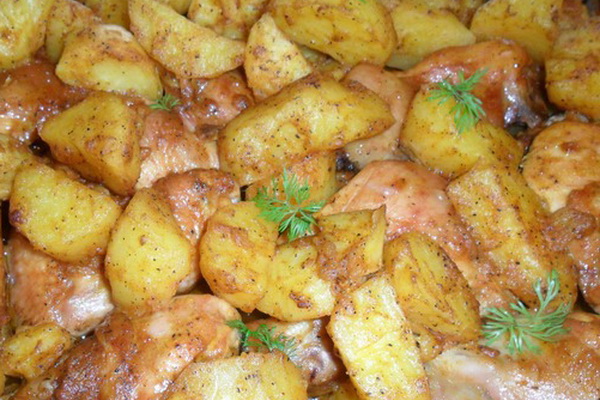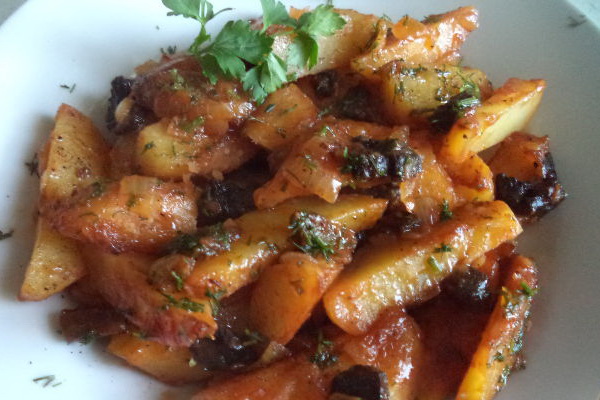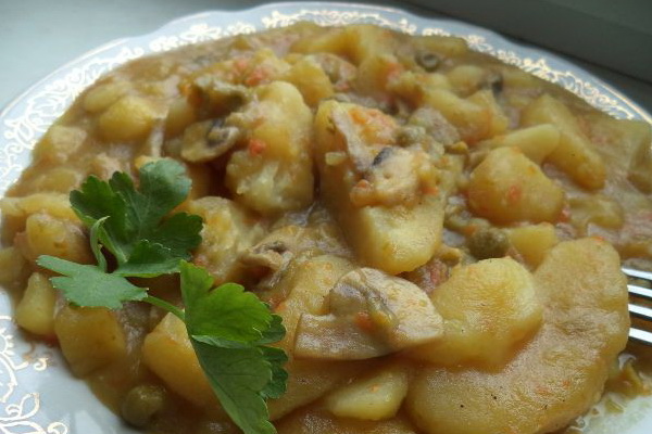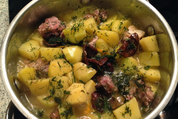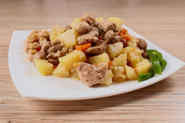 La viande préparée avec les pommes de terre est versée avec la sauce et portée à ébullition. Les légumes sont servis avec un rôti de porc avec des pommes de terre et des champignons.