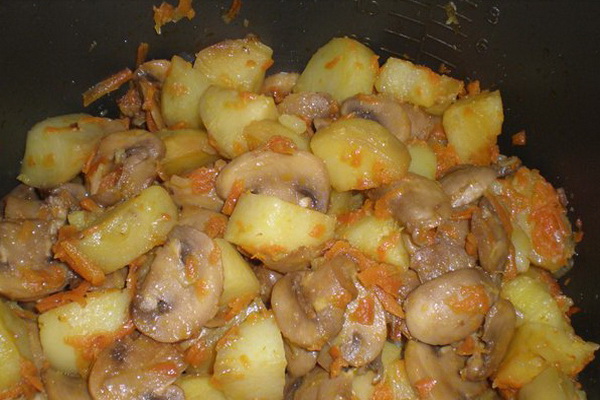 Préparation: faites frire les oignons hachés et les carottes râpées dans une mijoteuse (mode de friture, 40 minutes). Après 15 minutes, ajoutez les champignons hachés, après 20 minutes, ajoutez la viande, faites-les frire jusqu'à la fin du régime. En fin de cuisson, mettez les pommes de terre, salez, poivrez, ajoutez un peu d'eau. Activez le mode «ragoût ou friture» pendant 1,5 heure. 15 minutes avant la fin de la cuisson, ajoutez de la crème sure. Rôti aux champignons et pommes de terre, cuit dans une cocotte minute, servir chaud.