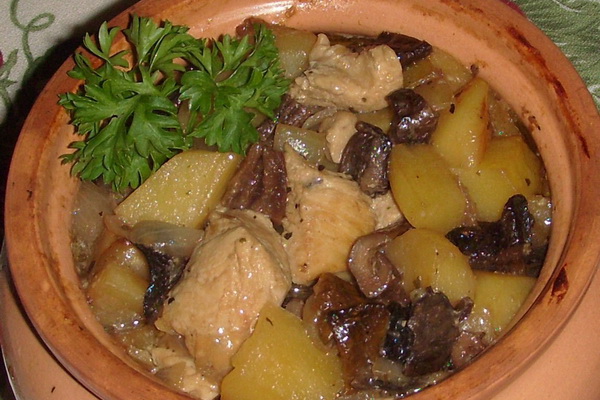 - Rôti fait maison dans des pots avec des champignons et des pommes de terre