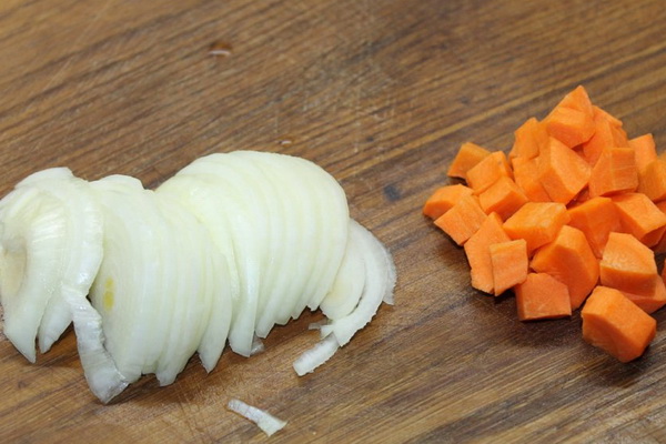 Coupez l'oignon en demi-rondelles, les carottes en fines tranches et faites-les dorer légèrement dans du beurre ou du gras. Couper les pommes de terre en petits carrés, hacher finement les champignons.