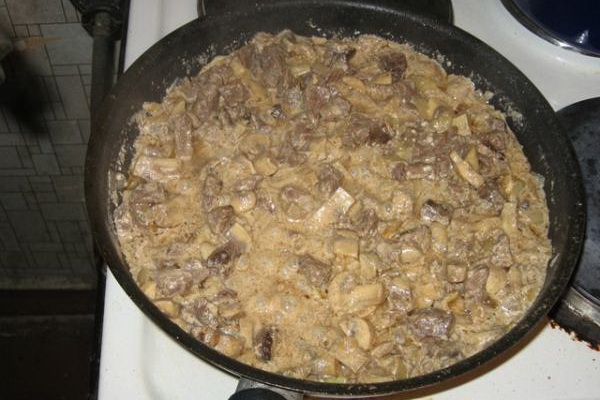 Les champignons sont finement hachés, frits et combinés avec de la farine et des tomates sautées et avec le jus dans lequel la viande a été cuite.