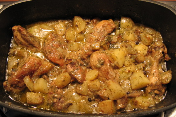 Couper les pommes de terre en lanières et les ajouter au reste des produits. Ajoutez un petit morceau de beurre, saupoudrez de fromage râpé et versez une sauce à base de mayonnaise, de crème sure, de lait et de légumes verts concassés. Une fois les pots remplis de produits, nous les mettons au four préchauffés à une température de 220 à 240 degrés pendant une demi-heure. Le rôti est prêt.
