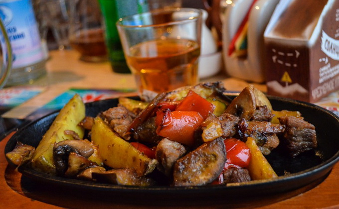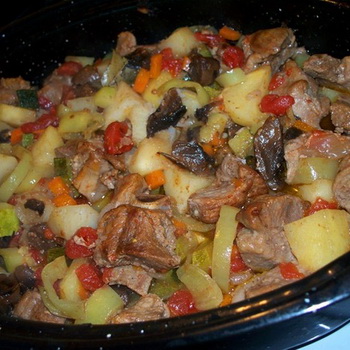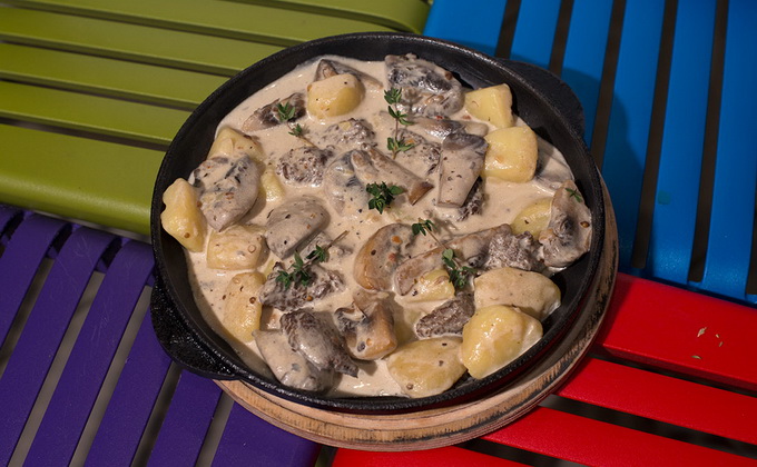 Peler les pommes de terre et les carottes, les laver, les couper en cubes et les faire frire dans l'huile. Couper les oignons en rondelles et les faire revenir dans l'huile jusqu'à ce qu'ils soient dorés. Couper les champignons pas très finement et les faire frire dans l'huile. Couper la viande en petits morceaux et les faire frire dans l'huile jusqu'à ce qu'ils soient dorés. Mettre la viande, les pommes de terre, les champignons, les oignons, les racines dans des pots en argile, saler, poivrer, verser le bouillon ou l’eau et laisser mijoter au four pendant 30 minutes. 10 minutes avant la cuisson, verser le rôti avec la viande, les champignons et les pommes de terre à la crème sure, parsemer d'ail, d'aneth et de persil finement hachés.