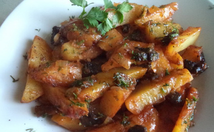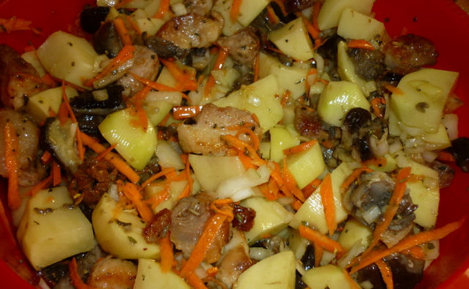 - Après 10 minutes, ajoutez des bouquets de céleri, d'aneth et de persil, noués avec un fil, ainsi que des pommes de terre grossièrement hachées, des champignons, des pruneaux et de l'ail. Salez, ajoutez le poivre noir. Ajouter les tomates, le jus de citron ou de grenade.