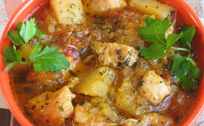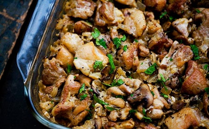 Laver la carcasse de poulet, couper en 8 parties, saler et faire frire à mi-cuisson. Coupez l'oignon en demi-rondelles et faites-le frire jusqu'à ce qu'il soit doré. Pelez, lavez, hachez et faites frire les champignons. Frire les noix, les peler et les hacher. Laver et sécher les raisins secs. Mettez le poulet dans des pots en argile, 2 morceaux par portion, ajoutez les raisins secs, les champignons, les oignons et les noix, versez la sauce à la crème sure. Mettez les casseroles dans le four et laissez mijoter pendant 20-25 minutes à une température de 180 ° C. Servir saupoudré d'herbes hachées. Pour la sauce rôtie à la viande et aux champignons, cuite au four, vous devez faire fondre et faire chauffer l'huile dans une casserole, ajouter la farine tamisée et faire frire légèrement en remuant jusqu'à ce que l'odeur de noix rôties apparaisse. Incorporer la farine en remuant constamment, diluer avec la crème sure chauffée.