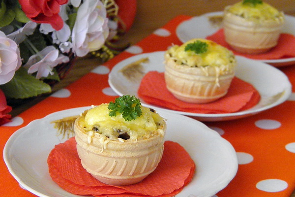 Une autre recette originale de julienne avec champignons au micro-ondes combine 2 idées culinaires merveilleuses: les tartelettes et, en fait, l’apéritif lui-même.